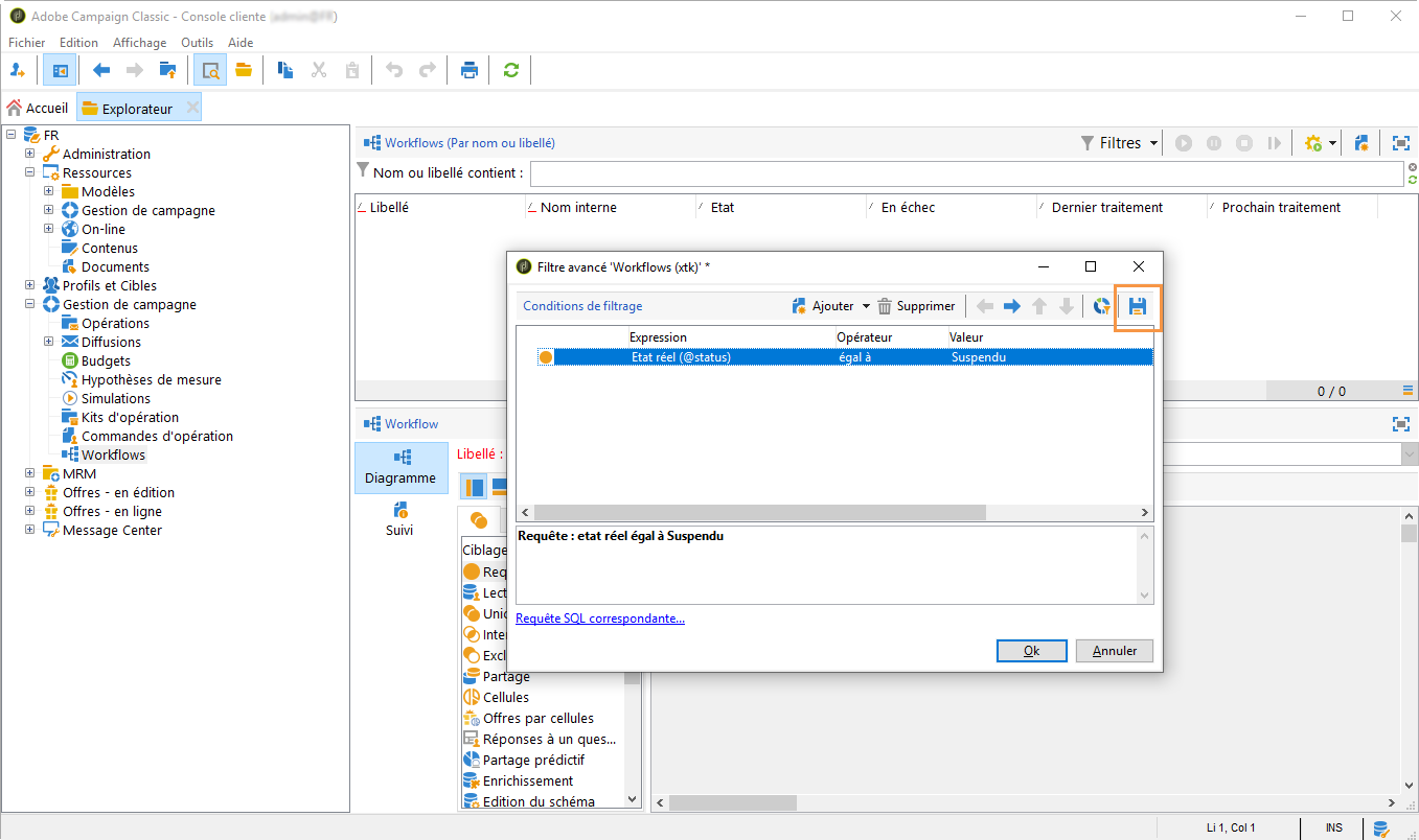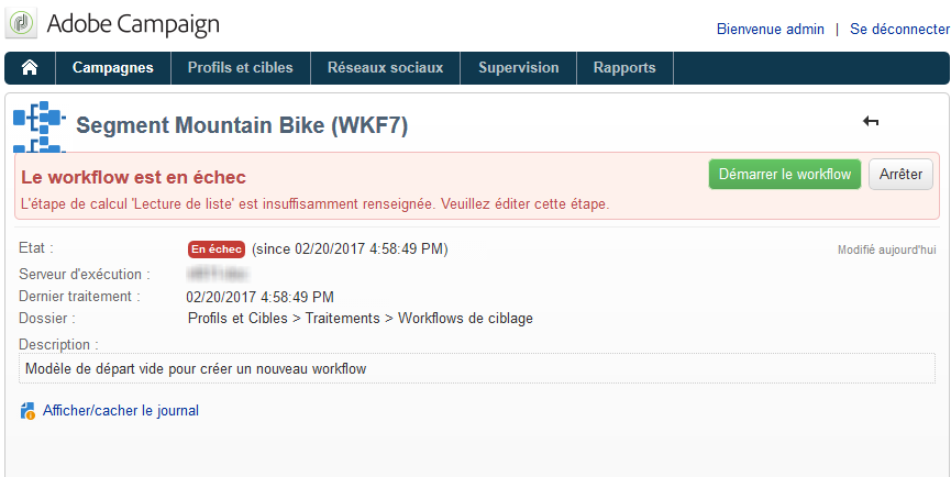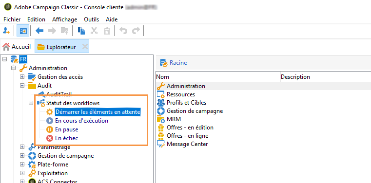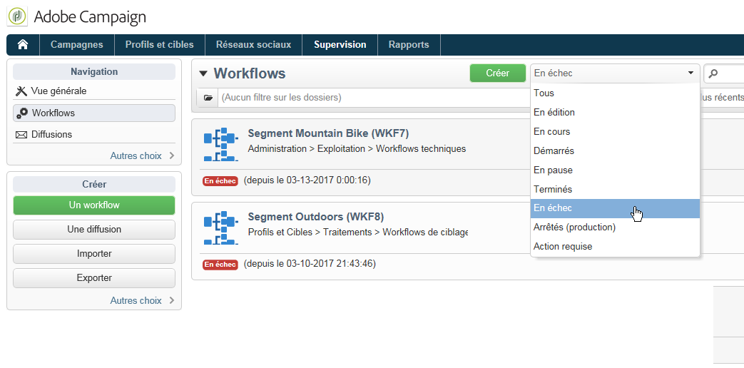 Dans l'Explorateur Adobe Campaign, la liste des workflows affiche par défaut une colonne En échec.