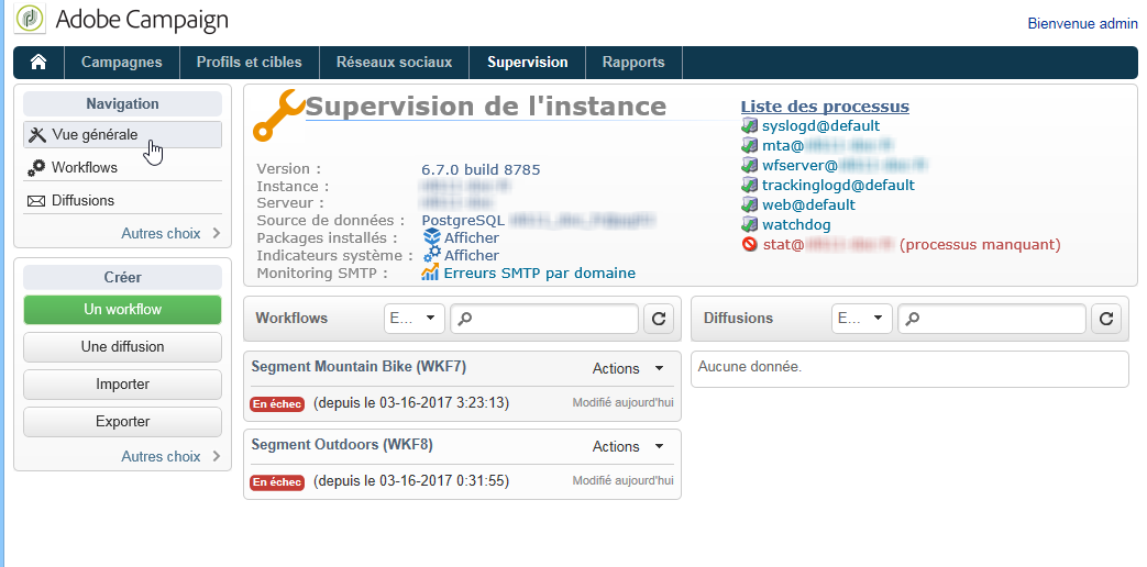 La page Supervision de l'instance permet de visualiser l'activité du serveur Adobe Campaign et de consulter la liste des workflows et des diffusions en échec.