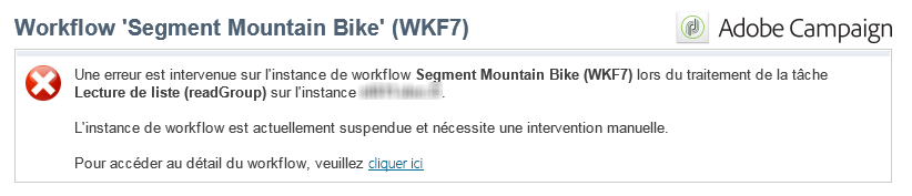 Le lien permet d'accéder en Web à la console Adobe Campaign et, après connexion, d'agir sur le workflow en erreur.