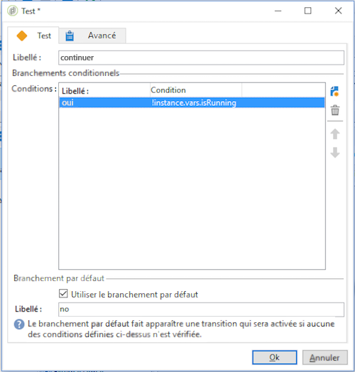 L'activité qui suit le Test dans la branche oui doit configurer la variable d'instance dans son Script d'initialisation :
