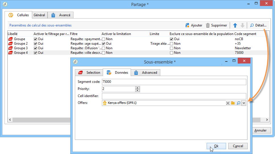 Cette activité peut être configurée afin de renseigner des paramètres spécifiques, selon les besoins de l'utilisateur. Par défaut, le détail de chaque sous-ensemble est décrit dans une fenêtre dédiée au travers des onglets Sélection et Avancé. Dans l'exemple ci-dessous, le formulaire a été modifié : un onglet Données a été ajouté afin de permettre l'association d'une offre et d'un niveau de priorité à chaque sous-ensemble.