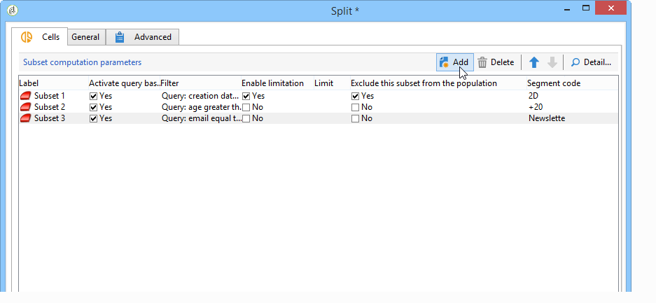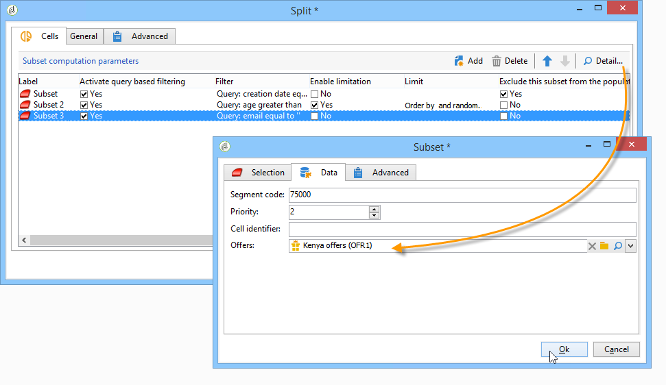 사용자 요구 사항에 따라 특정 매개 변수를 입력하도록 이 활동을 구성할 수 있습니다. 기본적으로 각 서브세트의 세부 정보는 를 통해 전용 창에 자세히 표시됩니다 Selection 및 Advanced 탭. 아래 예에서는 양식이 수정되었습니다. a Data 각 하위 세트에 대한 오퍼 및 우선 순위 수준을 연결할 수 있도록 탭이 추가되었습니다.