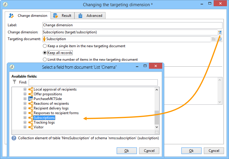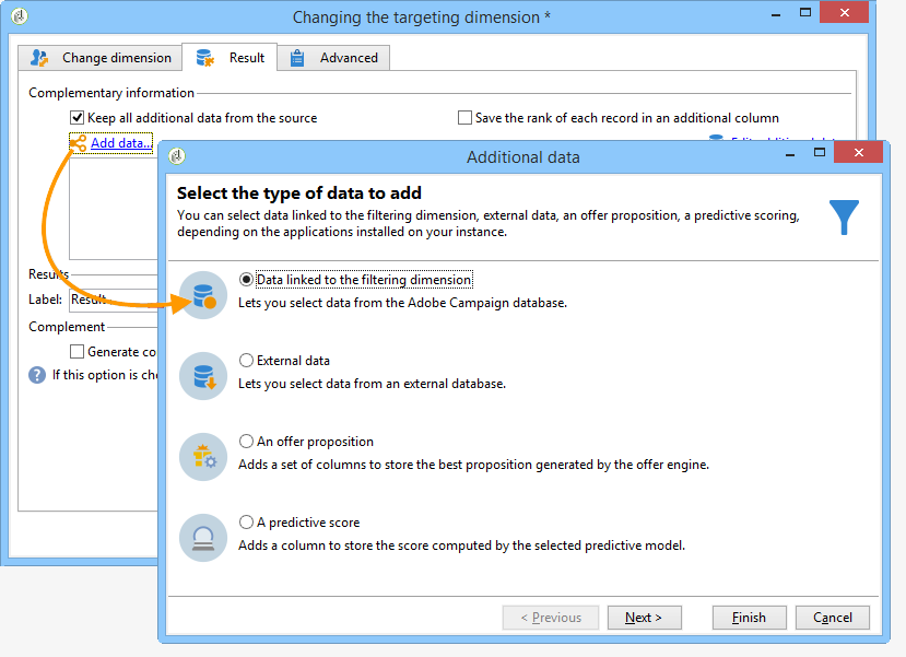 차원 변경 활동을 사용하면 타겟 구성 주기 동안 타겟팅 차원을 변경할 수 있습니다. 축 이동은 데이터 템플릿과 입력 차원에 따라 다릅니다. 예를 들어 "계약" 차원에서 "클라이언트" 차원으로 전환할 수 있습니다.