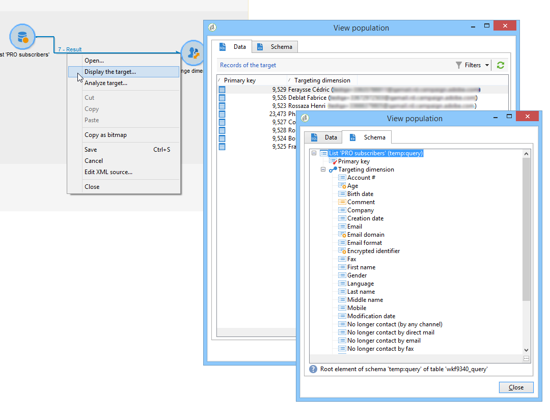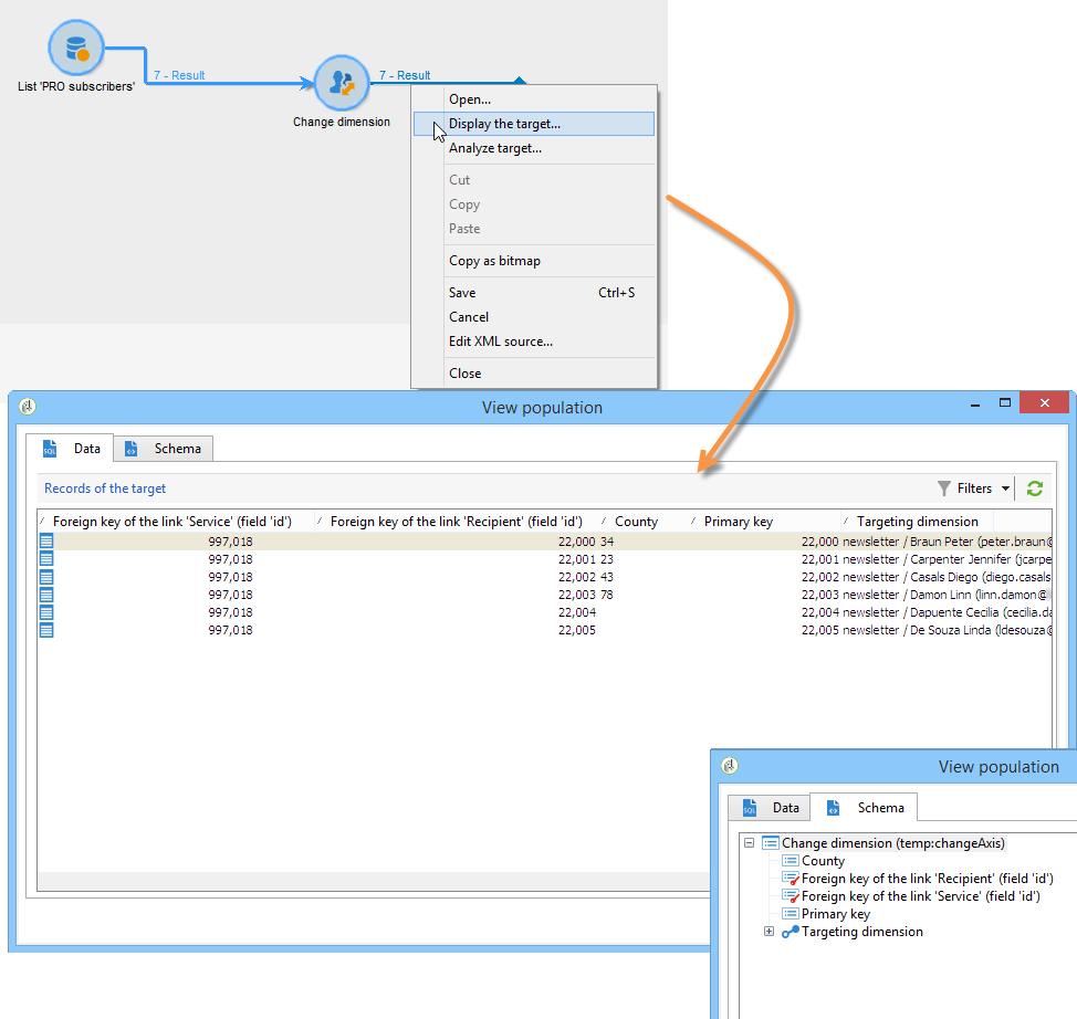 워크플로우를 실행하여 이 구성 결과를 확인합니다. 차원 변경 활동 전후의 테이블의 데이터를 비교하고 다음 예와 같이 워크플로우 테이블의 구조를 비교합니다.