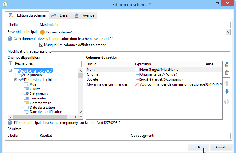 Les données peuvent être transformées, normalisées et, au besoin, enrichies dans le workflow en utilisant l'activité Edition du schéma. Elle est généralement utilisée pour normaliser la structure des données : vous pouvez renommer les colonnes de sortie ou modifier leur contenu, par exemple en calculant la moyenne des valeurs d'un champ ou un agrégat.