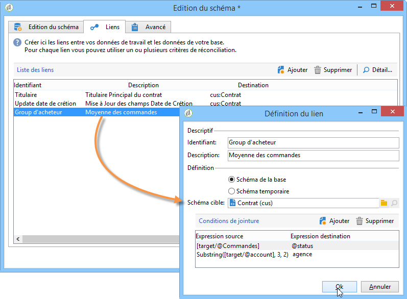 Vous pouvez également créer des jointures avec d'autres tables de travail, à partir de l'onglet Liens.