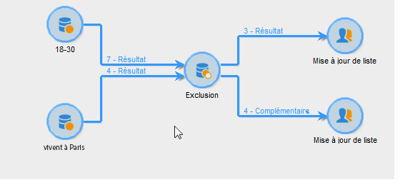 Exécutez le workflow. Dans cet exemple, le résultat comporte tous les destinataires âgés de 18 à 30 ans, mais ceux habitant à Paris sont exclus et sont envoyés vers le complémentaire.
