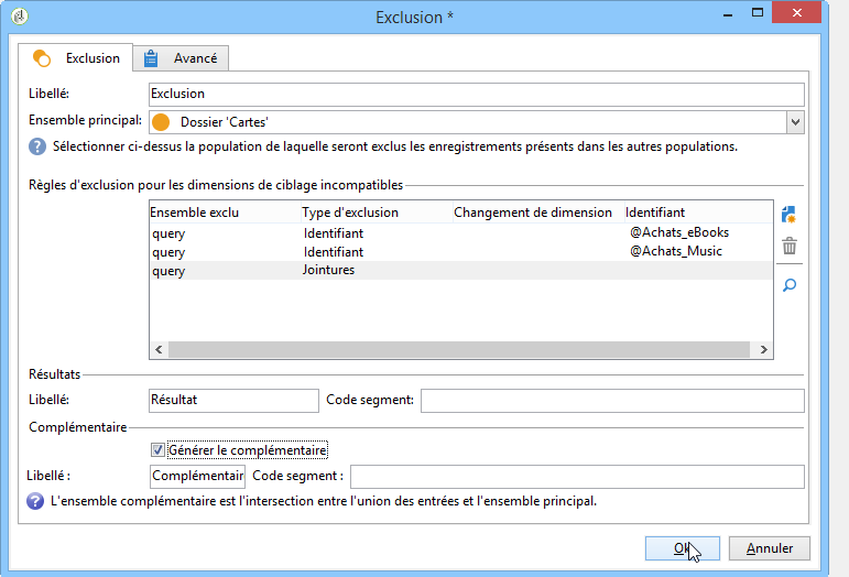 Cochez la case Générer le complémentaire si vous souhaitez exploiter les données non retenues après l'exclusion. Dans le cas présent, le complément comporte les destinataires âgés de 18 à 30 ans habitant à Paris.
