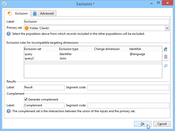 을(를) 확인합니다. Generate complement 제외 후에 남아 있는 데이터를 활용하려면 선택 사항을 선택합니다. 이 경우, 그 보수는 파리에 사는 18세에서 30세 사이의 수신자들로 구성되어 있다.