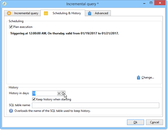 에서 Scheduling & History 탭에서 을 선택합니다 Schedule execution 선택 사항입니다. 작업은 일단 생성되면 활성 상태로 유지되며 쿼리 실행 일정에 의해 지정된 시에만 트리거됩니다. 그러나 이 옵션을 비활성화하면 쿼리가 즉시 실행됩니다 한 번에.