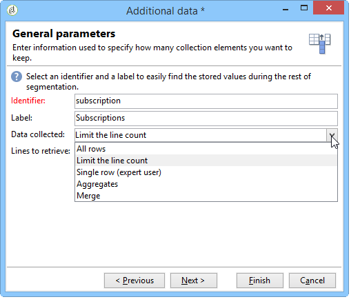 If necessary, specify the number of elements of the collection that you want to keep by selecting one of the values in the Data collected field. By default, all the lines of the collection are recovered then filtered according to the conditions specified at the following step.