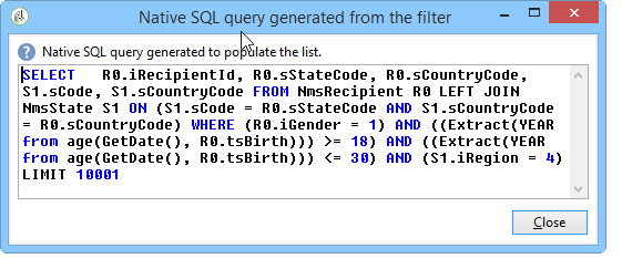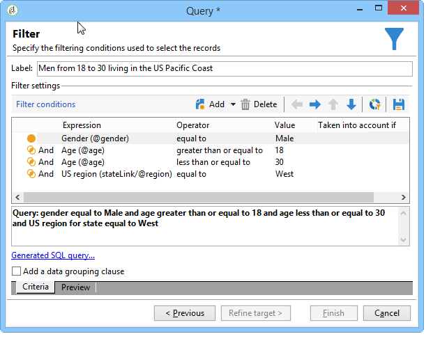 You can also add more criteria by using the Expression builder and combining it with the logical options AND, OR, and EXCEPT. You can then preview the Corresponding SQL query… for your criteria combination. For more on this refer to this section.