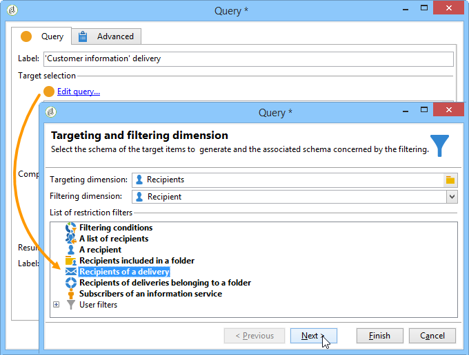 Select the targeting and filtering dimension. By default, the target is selected from the recipients. The list of restriction filters is the same as those used for delivery targeting.