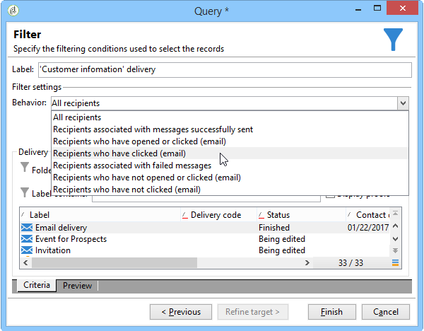 Enter the different criteria for the proposed target. Here criteria are combined using the AND option. To be included in the selection, the recipients will have to fulfill following four conditions: