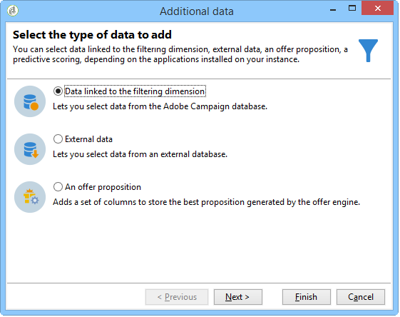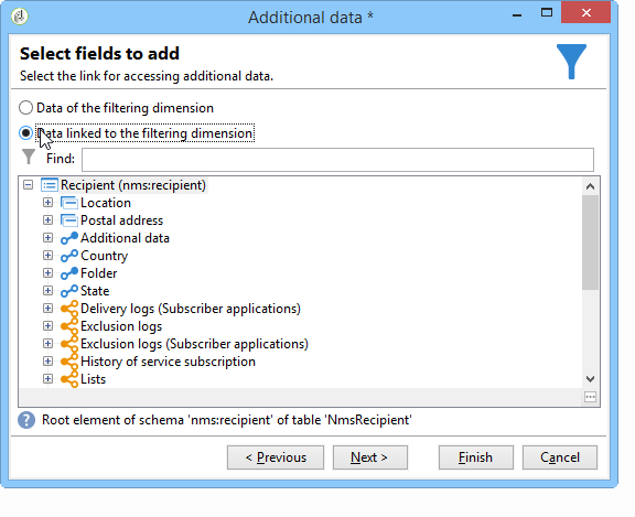 Select the type of data you want to add. This can be data belonging to the filtering dimension or data stored in linked tables.