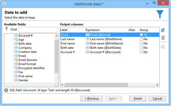 The additional columns let you collect additional information on the targeted population, e.g. contract numbers, subscriptions to newsletters or origin. This data can be stored in the Adobe Campaign database or in an external database.
