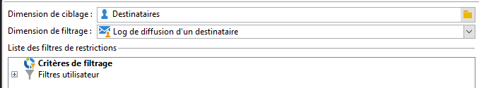 Sélectionnez la dimension de ciblage et de filtrage. Par défaut, la cible est sélectionnée parmi les destinataires. La liste des filtres de restriction est la même que celle utilisée lors du ciblage d'une diffusion.