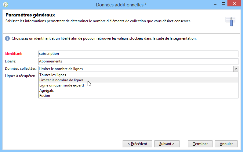 Si vous choisissez de récupérer plusieurs lignes (Limiter le nombre de lignes), vous pouvez indiquer le nombre de lignes à collecter.