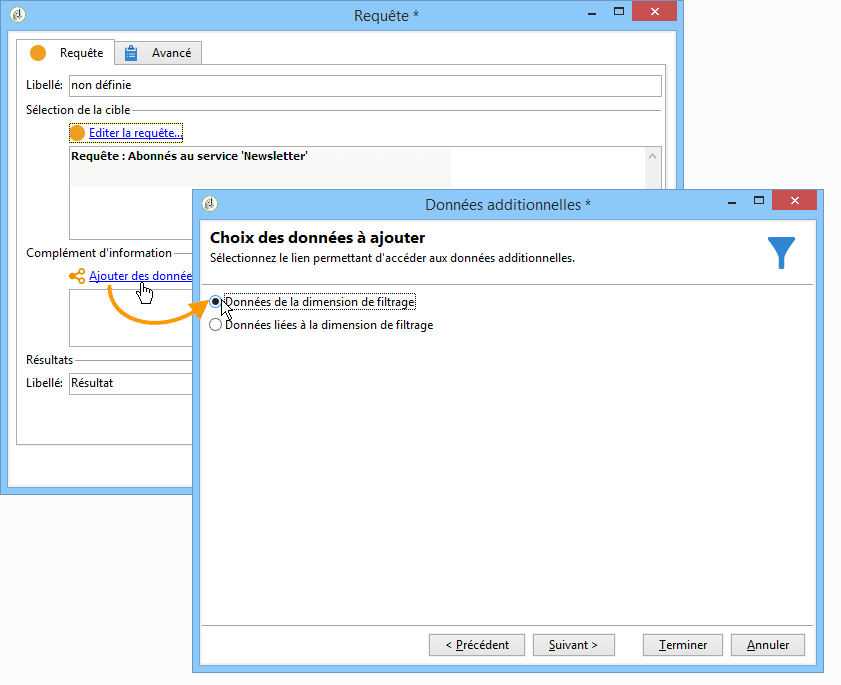 Sélectionnez l'option Données liées à la dimension de filtrage à la première étape de l'assistant :
