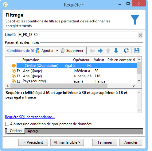 Renseignez les différents critères correspondant à la cible souhaitée. Ici, les critères sont combinés à l’aide de l’opérateur ET. Pour faire partie de la sélection, ils devront donc réunir les quatre conditions suivantes :