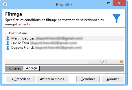 Affichez un aperçu des destinataires correspondant à votre requête via l'onglet correspondant afin de vérifier que vos critères sont correctement renseignés :