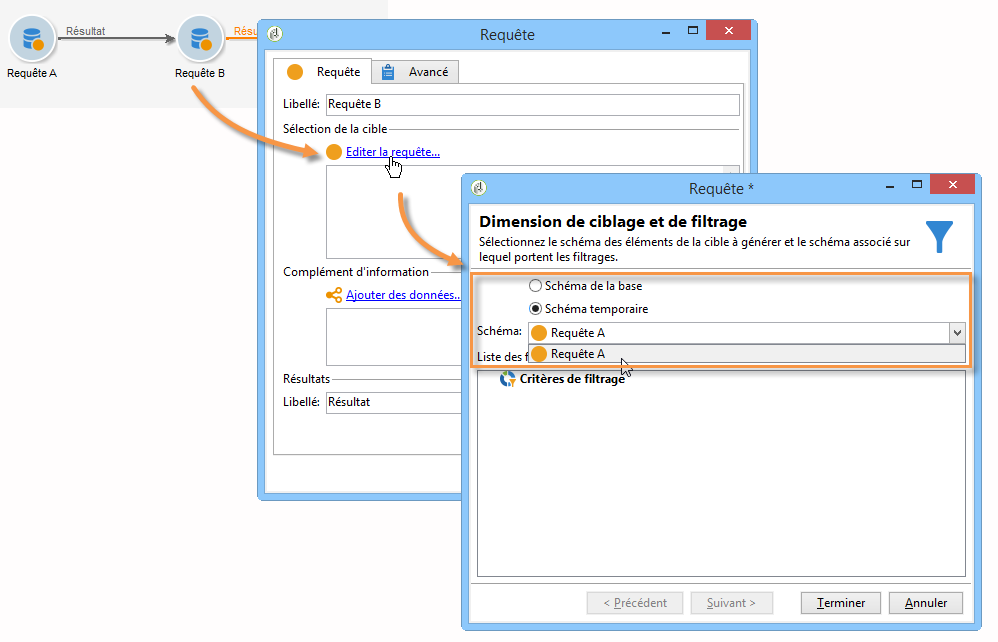 Une requête peut être basée sur les données de la transition entrante, le cas échéant, en sélectionnant Schéma temporaire lors du choix des dimensions de ciblage et de filtrage.