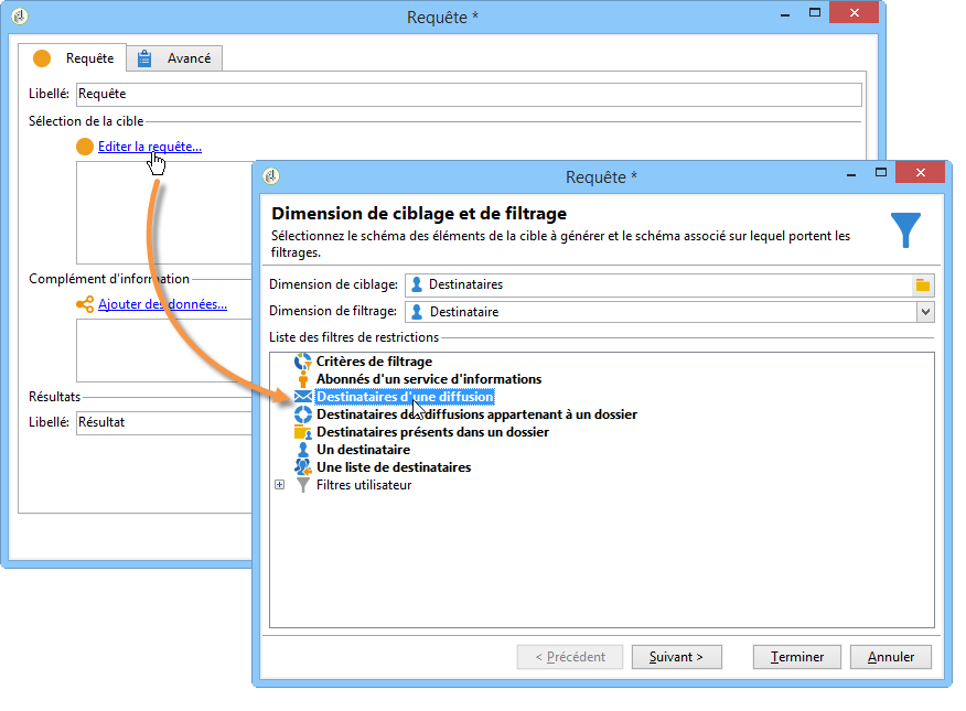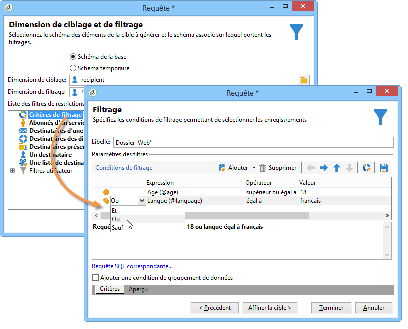 Le lien Editer la requête… permet de définir le type de ciblage, les restrictions et les critères de sélection de la population de la manière suivante :