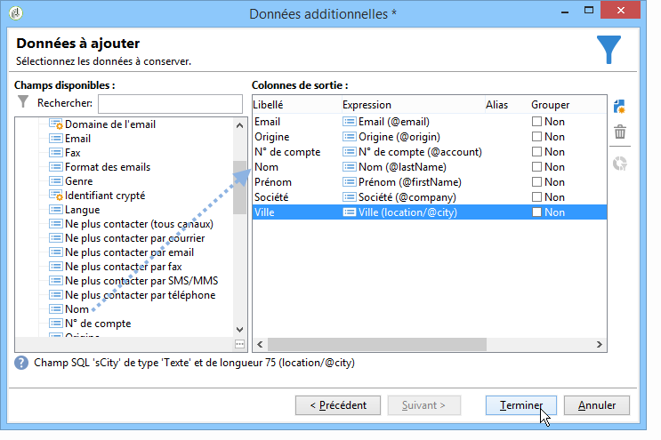 Lorsque les données appartiennent à la dimension de filtrage de la requête, il suffit de les sélectionner dans la liste des champs disponibles afin de les faire apparaître parmi les colonnes de sortie.