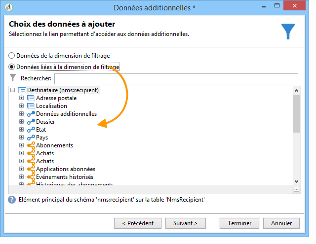Sélectionnez le type de données que vous souhaitez ajouter. Il peut s'agir de données appartenant à la dimension de filtrage ou de données stockées dans des tables liées.