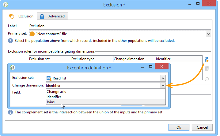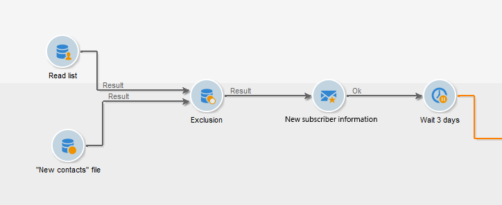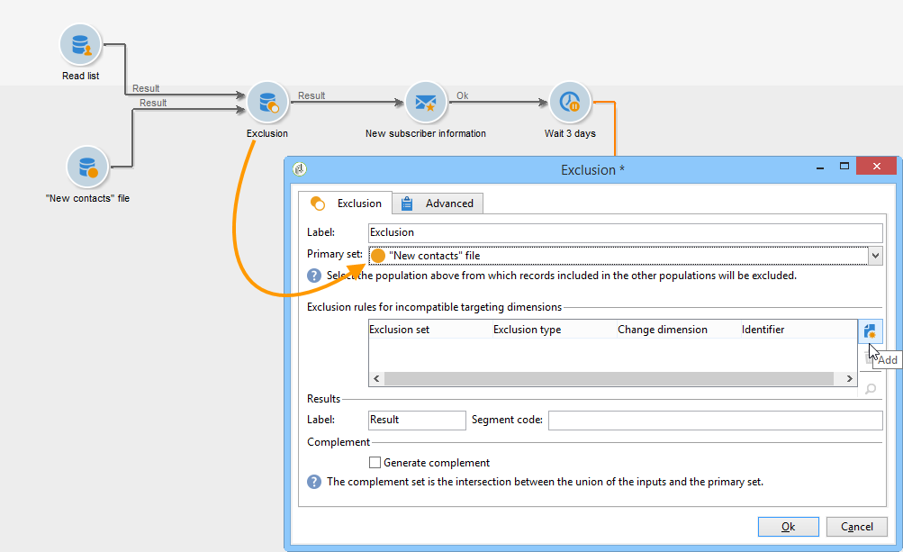 기본 대상에서 외부 목록의 이메일 주소를 제외하려면 제외 활동을 구성하고 새 연락처 폴더에는 유지할 데이터가 포함되어 있습니다. 이 세트와 제외 활동에서 다른 인바운드 세트 간의 결합 데이터가 대상에서 삭제됩니다.