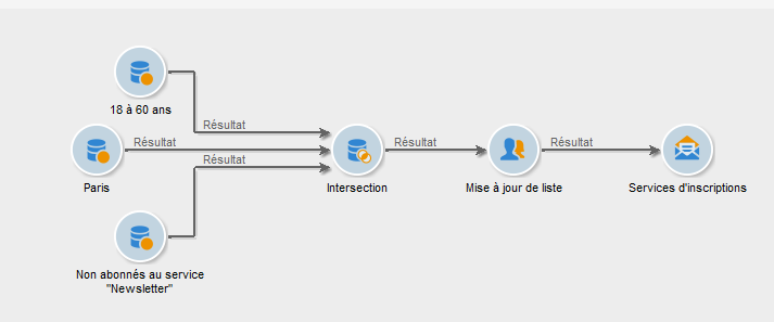 Le workflow suivant a pour but de recenser les destinataires éligibles afin de les inscrire, en une seule opération, à une newsletter destinée aux personnes dans la vie active résidant à Paris.