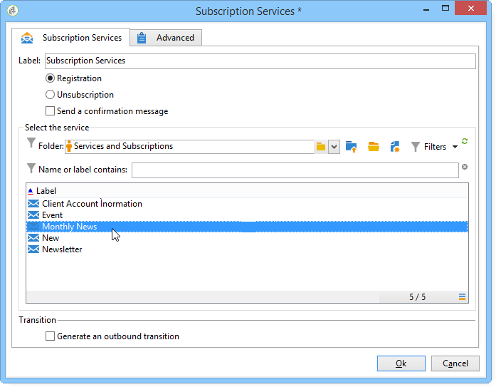 A 구독 서비스-type 활동을 사용하면 전환에서 지정된 모집단에 대한 정보 서비스 구독을 만들거나 삭제할 수 있습니다.