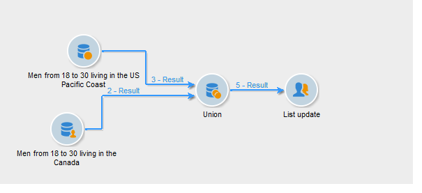 워크플로우 시작. 결과 수가 표시되고 목록 업데이트 활동에 정의된 목록이 생성되거나 업데이트됩니다. 이 목록에는 쿼리 및 적용 가능한 경우 이전 단계에서 정의한 번호에 대한 수신자 세트가 포함되어 있습니다.
