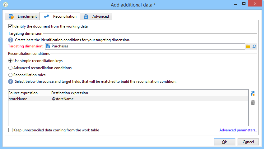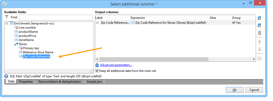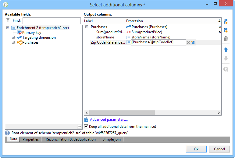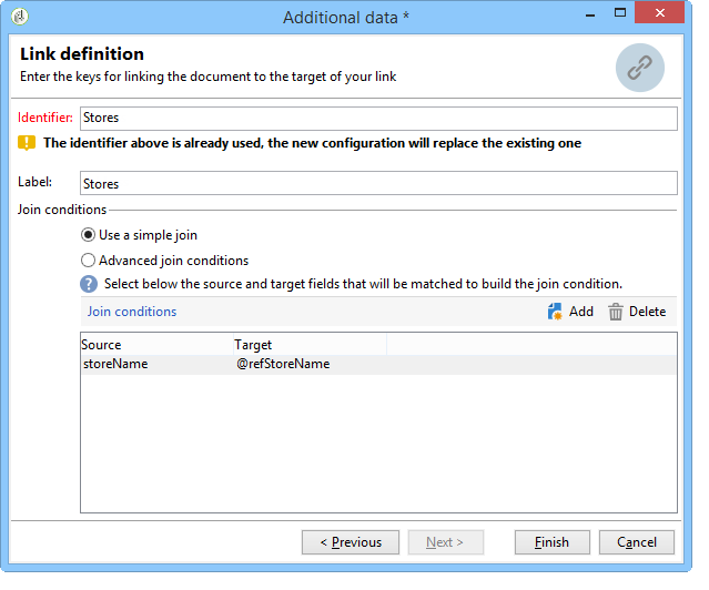다음 창에서는 데이터 조정을 구성하기 위해 소스 필드(기본 세트에서)와 대상 필드("저장소" 스키마에 속하는)를 선택하여 조인 조건을 만들어야 합니다.