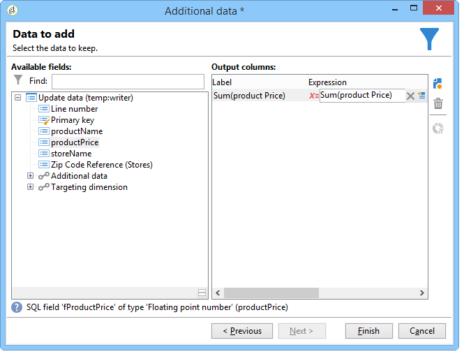 각 연락처에 대한 구매 합계를 계산하려면 다음 표현식을 추가합니다. "Sum(@prodprice)"