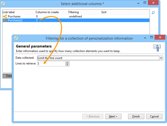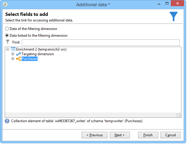 연락처 스키마는 "구매" 스키마에 실제로 연결됩니다. 즉, "데이터 보강" 옵션의 다른 옵션을 사용할 수 있습니다. 필터링 차원에 연결된 데이터 추가