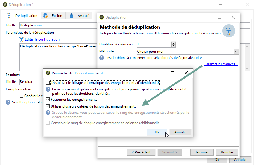 Cliquez sur le lien Paramètres avancés, puis activez les options Fusionner les enregistrements et Utiliser plusieurs critères de fusion des enregistrements.