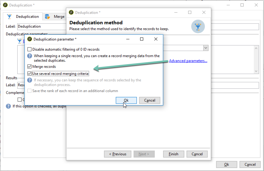을(를) 클릭합니다. Advanced parameters 링크를 클릭한 다음 를 활성화합니다 Merge records 및 Use several record merging criteria 옵션.