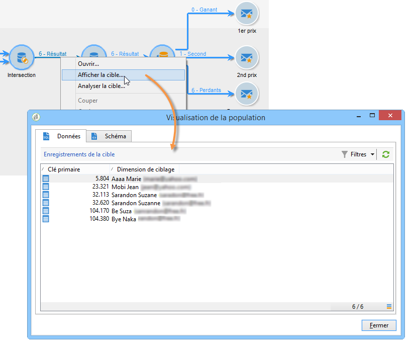 Renouvelez cette opération sur la transition sortante de l'activité d'enrichissement. Vous pouvez constater que les données relatives au score des destinataires ont été ajoutées. Pour chaque destinataire, le score le plus élevé a bien été récupéré.