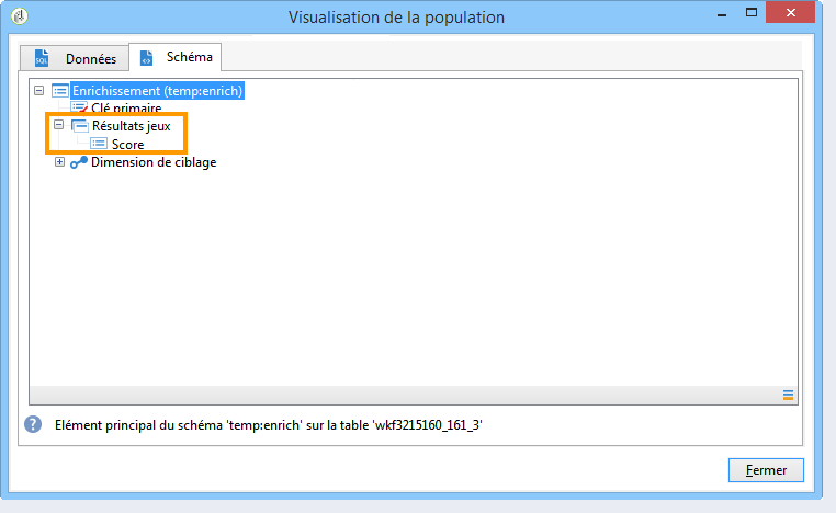 Dans notre exemple, nous souhaitons personnaliser les diffusions en fonction du champ Score, stocké dans la table Résultats jeux. Cette table possède un lien de type 1-n avec la table des destinataires. L'activité Enrichissement nous permet d'ajouter, dans la table de travail du workflow, des données provenant d'une table liée à la dimension de filtrage.