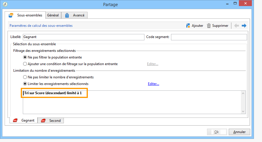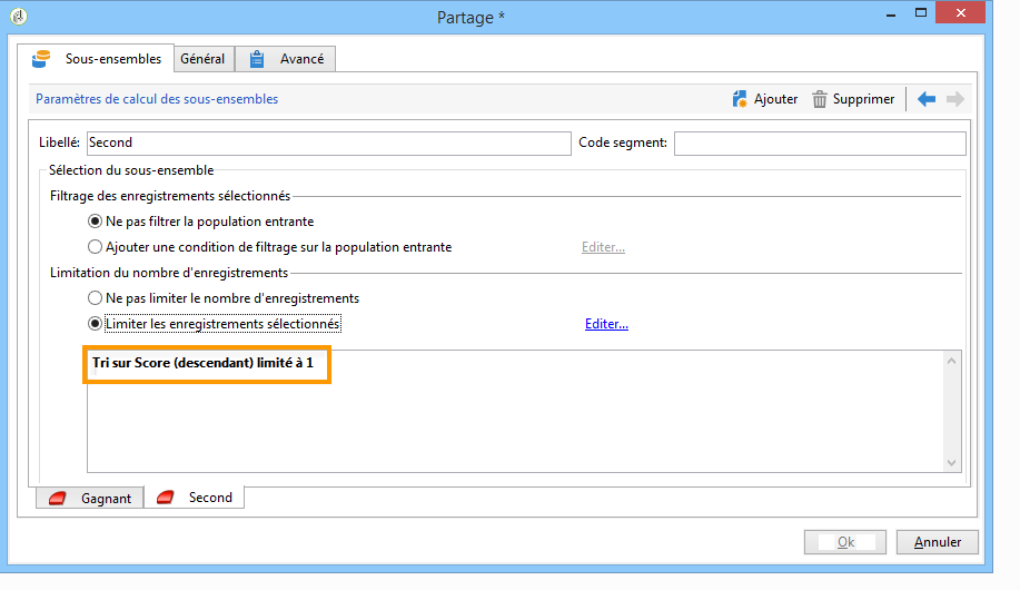 Un premier sous-ensemble (Gagnant), a été défini pour inclure le destinataire ayant obtenu le meilleur score. Pour cela, définissez une limitation du nombre d'enregistrements, appliquez un tri descendant sur le score, et limitez le nombre d'enregistrements à 1.