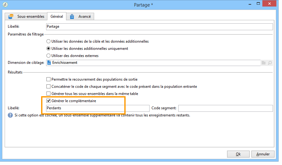 Le troisième sous-ensemble (Perdants) contient tous les autres destinataires. Dans l'onglet Général, cochez la case Générer le complémentaire pour cibler tous les destinataires qui n'ont pas obtenu les deux meilleurs scores.