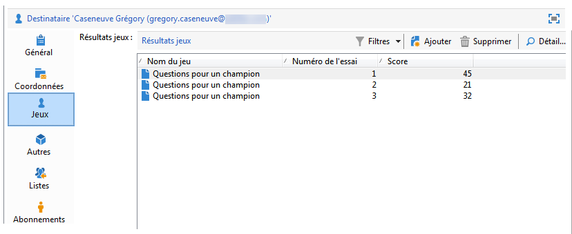 Un même contact présent dans la table des Destinataires peut être associé à plusieurs lignes dans la table Résultats jeux. Le lien entre les deux tables est donc de type 1-n. Voici un exemple des logs de résultats pour un destinataire :