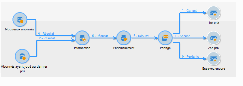 L'objectif de ce cas d'utilisation est d'envoyer des diffusions personnalisées aux participants du dernier jeu concours en fonction du meilleur score qu'ils ont obtenu au cours de leurs différents essais. Le participant qui a obtenu le meilleur score se voit offrir le 1er prix, celui qui a obtenu le second score reçoit un lot de consolation, et tous les autres reçoivent un message leur proposant de retenter leur chance lors du prochain jeu.