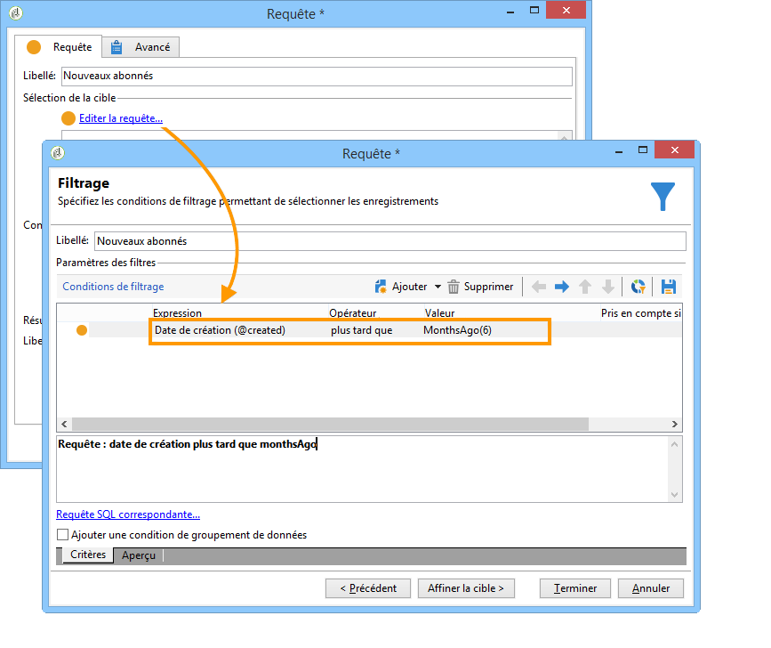 La première requête permet de cibler les destinataires qui ont été ajoutés dans la base au cours des six derniers mois.