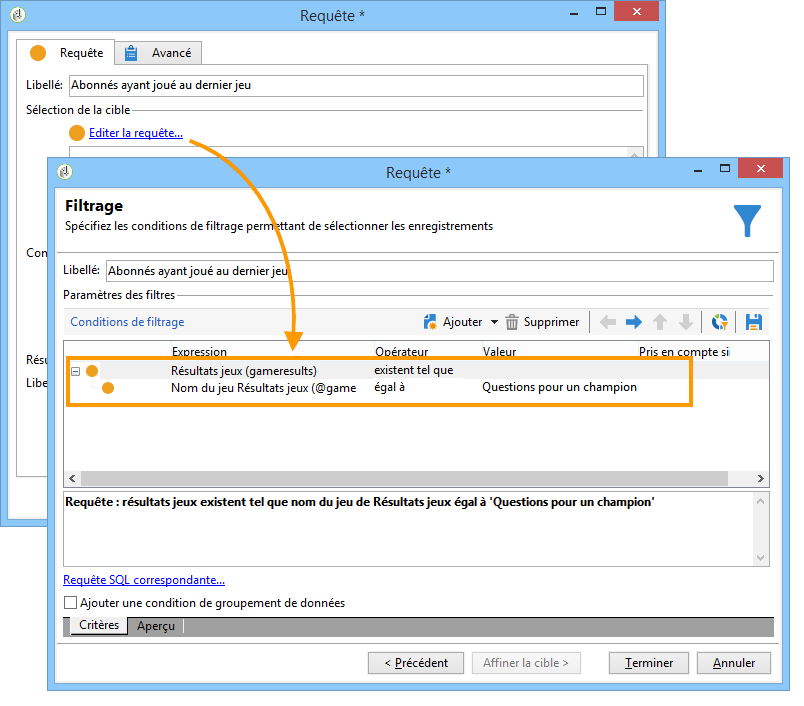 La seconde requête permet de cibler les destinataires ayant participé au dernier jeu.