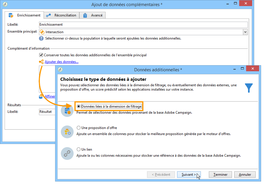 Dans l'écran d'édition de l'activité d'enrichissement, sélectionnez Ajouter des données, puis Données liées à la dimension de filtrage, et cliquez sur Suivant.