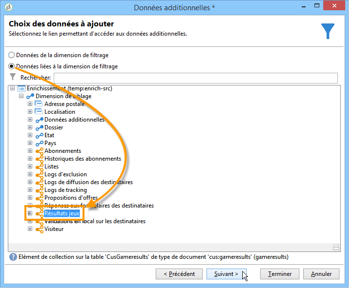 Choisissez ensuite l'option Données liées à la dimension de filtrage, sélectionnez la table Résultats jeux, et cliquez sur Suivant.