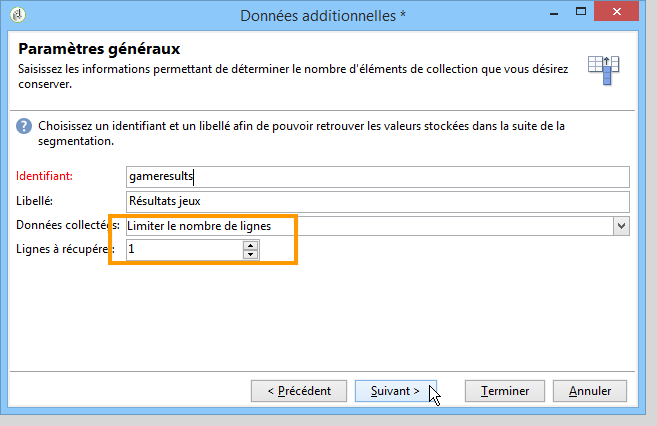 Saisissez un identifiant et un libellé, et choisissez l'option Limiter le nombre de lignes, dans le champ Données collectées. Dans le champ Lignes à récupérer, choisissez la valeur '1'. Pour chaque destinataire, l'activité d'enrichissement ajoutera, à la table de travail du workflow, une seule ligne provenant de la table Résultats jeux. Cliquez sur Suivant.