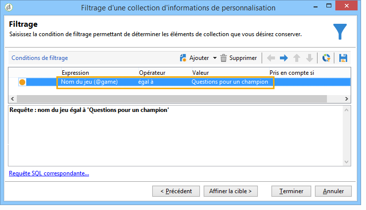 Dans notre exemple, nous souhaitons récupérer le meilleur score du destinataire, mais uniquement sur le dernier jeu. Pour cela, ajoutez un filtre sur le champ Nom du jeu pour exclure toutes les lignes correspondant aux jeux précédents. Cliquez sur Suivant.